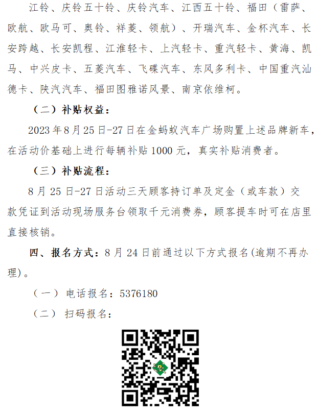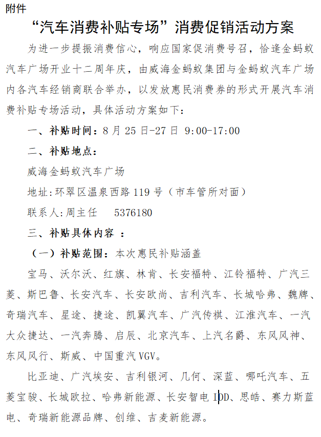 為落實(shí)“山東消費(fèi)提振年”決策部署,根據(jù)市區(qū)兩級政府促消費(fèi)工作的有關(guān)要求,為進(jìn)一步激發(fā)市場活力,釋放消費(fèi)潛力,活躍我區(qū)消費(fèi)市場,8月25日-27日,威海金螞蟻集團(tuán)與金螞蟻汽車廣場內(nèi)各汽車經(jīng)銷商在環(huán)翠區(qū)內(nèi)開展汽車惠民補(bǔ)貼活動,活動以發(fā)放消費(fèi)券與報(bào)名方式進(jìn)行。